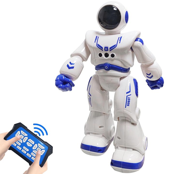Интерактивен робот с дистанционно управление, Rqiurpn, програмируем, бял/син, 12.8×9.5x29cm, комплект с дистанционно управление