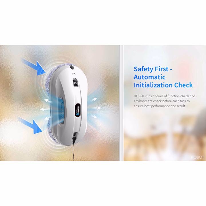 Едно от основните преимущества на Hobot 368 спрямо конкурентите е системата за безопасност и управление. Освен вградения умален апарат за откриване на граници (рамки и ръбове), които предотвратяват изпадане или задържане на устройството на неудобни места, Hobot 368 разполага със защитно страховъчно въже с дължина 4,5 метра, което допълнително обезопасява ползването му по високите прозорци.