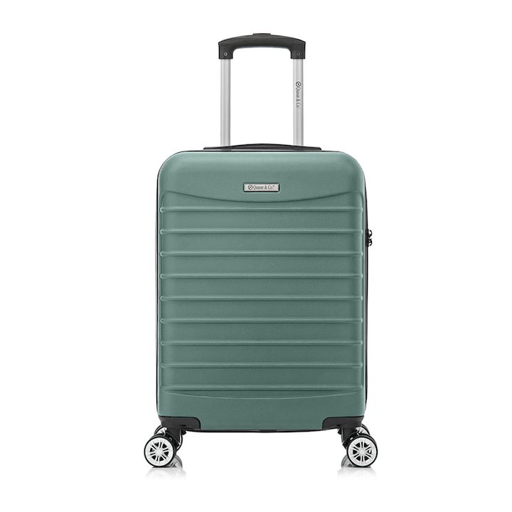Кабинният куфар Quasar & Co.® модел LINE е изработен от здрава ABS пластмаса, която е същевременно устойчива и лека, защитавайки багажа ви от удари и атмосферни условия. Опцията с двойно защитен цип и вградено кодово заключване гарантира, че вещите ви са максимално обезопасени по време на пътуване. Четирите двойни колела с 360° въртеливост дават изключителна маневреност и безшумна работа, а телескопичната дръжка увеличава комфорта при придвижване. Размерите и теглото му го правят подходящ за използване като ръчен багаж, което е особено удобно при полети. Тюркоазеният цвят му придава свеж и стилен вид, който го отличава от стандартните куфари.