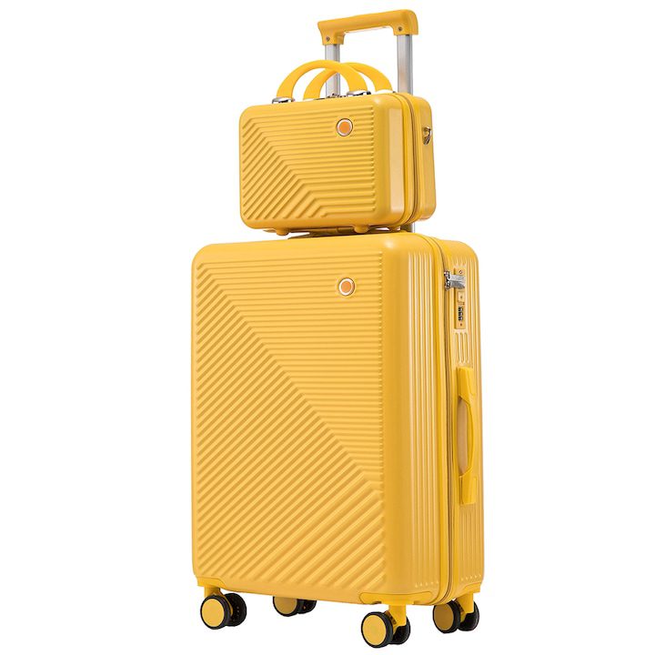 Комплект салонен куфар с козметична чанта, Quasar & Co.®, 55 x 39 x 23 см, ръчен багаж, куфар с ключалка, дълга телескопична дръжка, куфар с 4 безшумни двойни колела 360°, 2 отделения с джоб, модел Meta, жълт