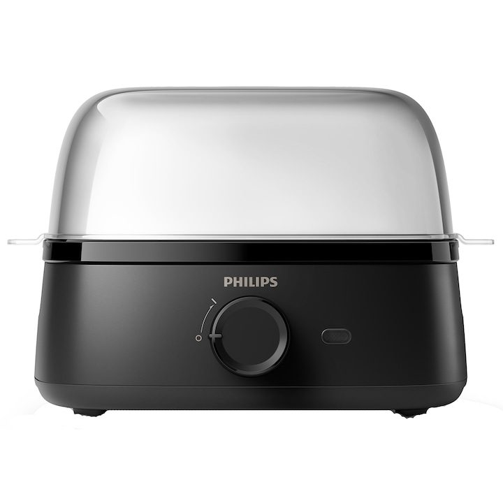 Яйцеварка Philips HD9137/90, 400 W, 6 яйца, Светлинен индикатор за включено състояние, Звуков сигнал за готовност, Градуирано стъкло, Аксесоар за пробиване на яйца, Аксесоар тава за поширани яйца, Черен